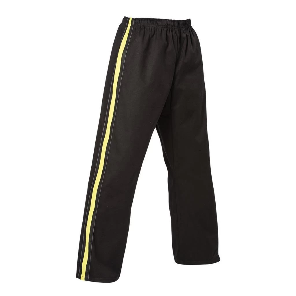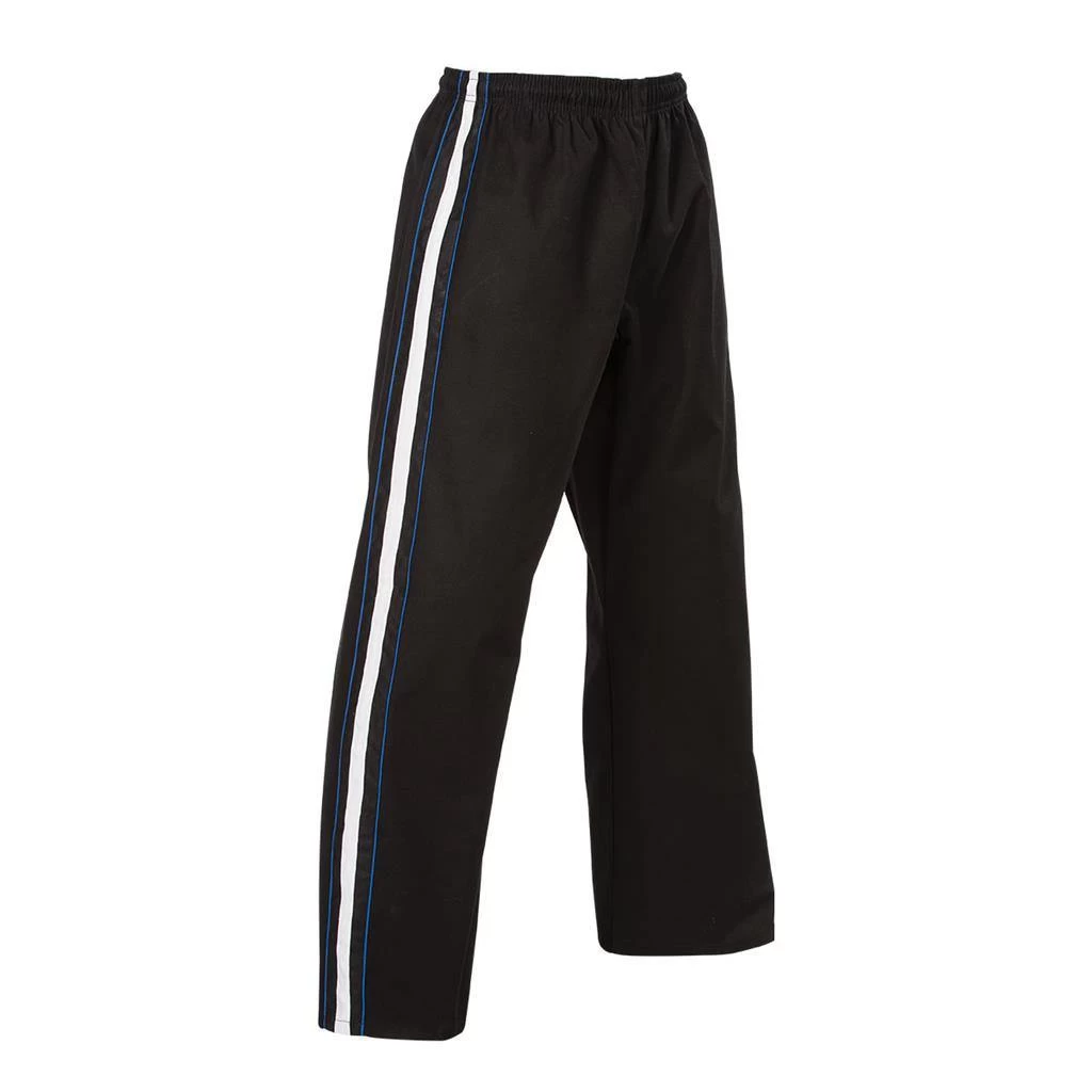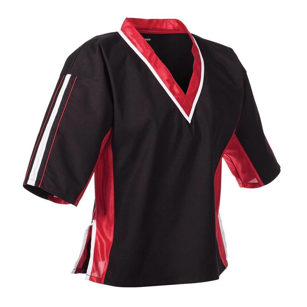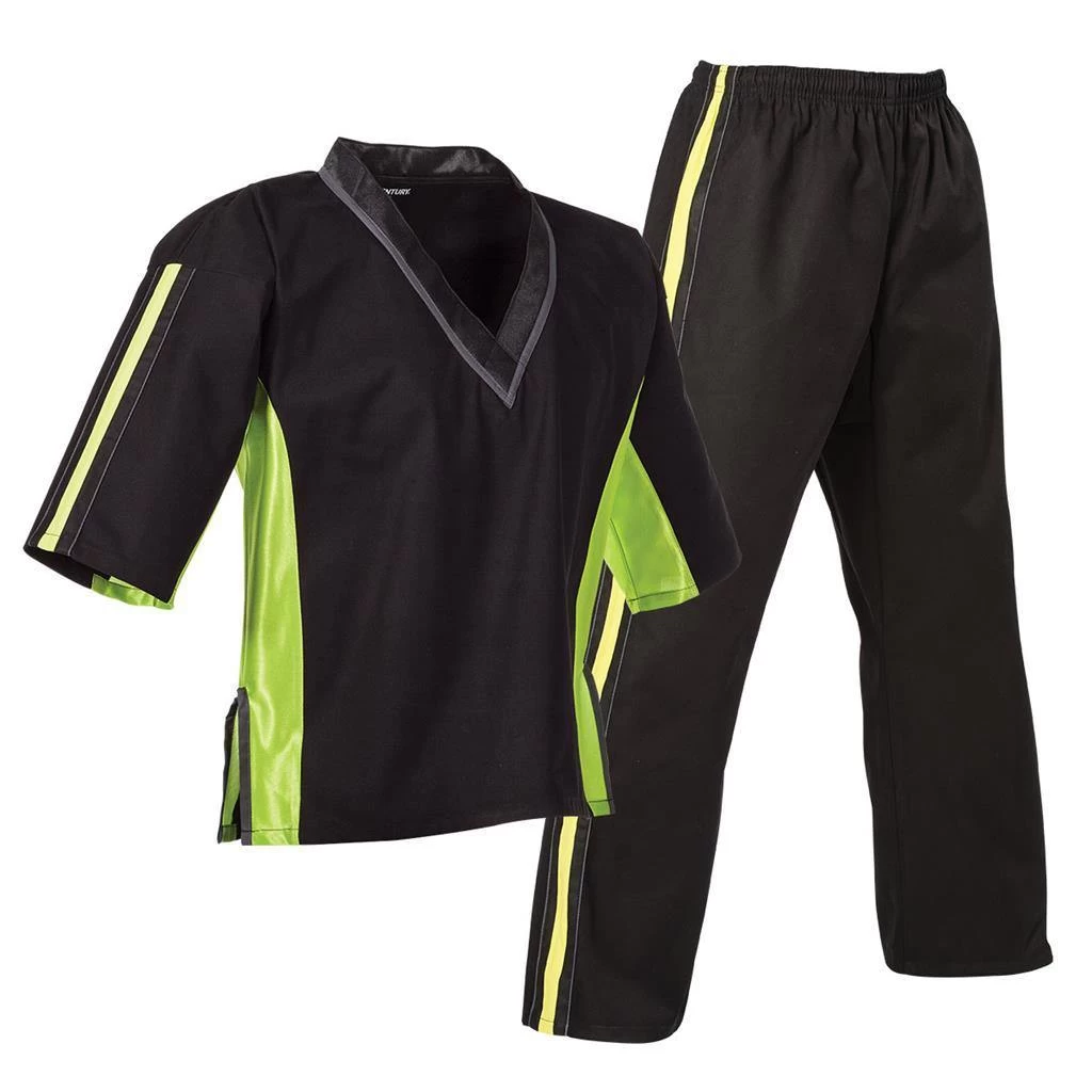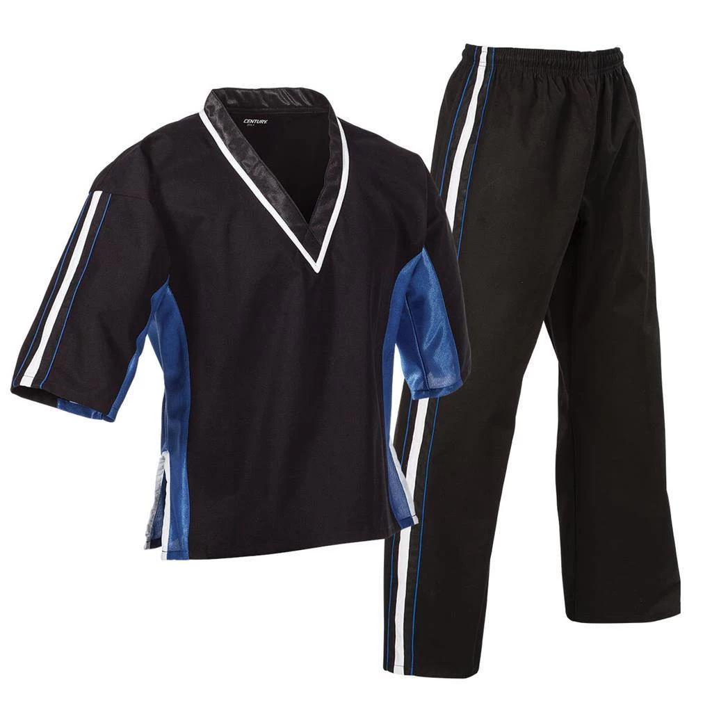 This middleweight, pullover style uniform features a V-neck construction with elastic waist pants and internal drawstring for a secure fit. Made with 100% cotton canvas for premium breathability, comfort, and durability, this uniform is great for using in school programs and for instructors. Its clean, modern design includes side vents, mesh inset panels, bold stripe accents and contrast seam binding. Imported