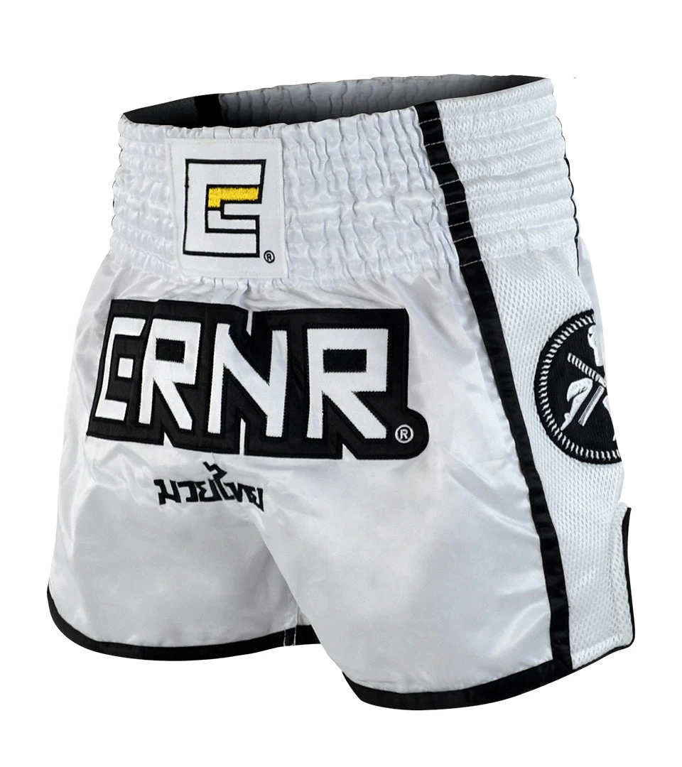 Combat Corner Professional Muay Thai shorts in a unique white and black color scheme.
