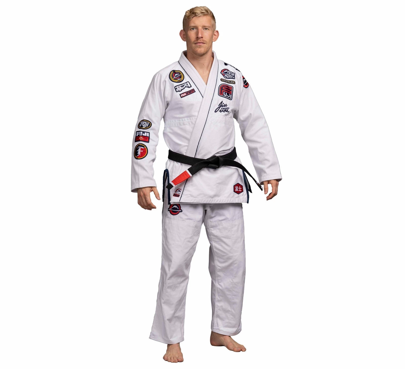 This gi’s design features contrast Stitching on Jacket & Pants, a Suparaito logo on the jacket, skirt, and pants. FUJI logos on Sleeve, Back of Neck, and Pants. Lastly, and outside taping on the skirt.