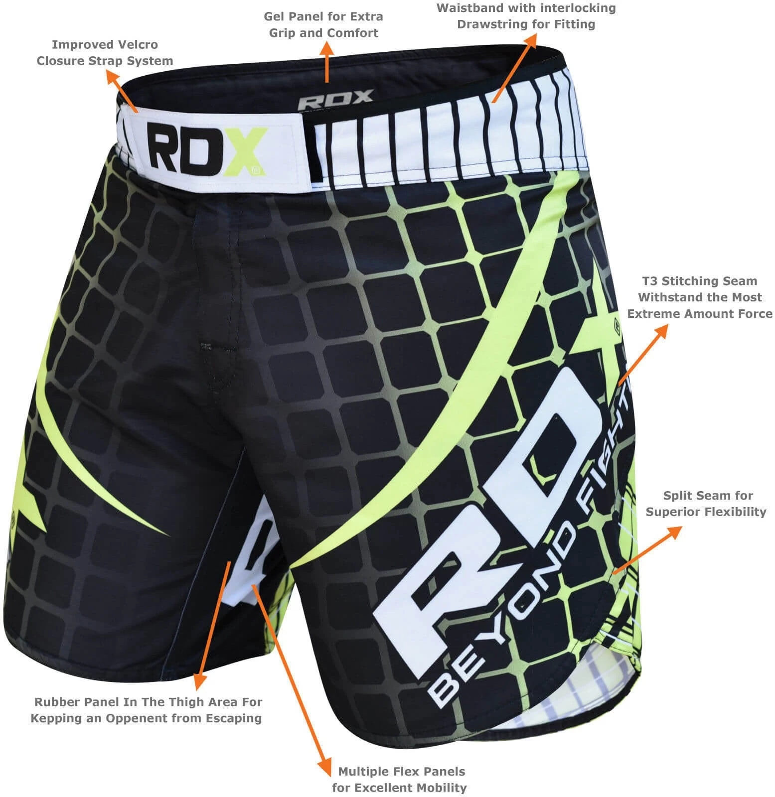 The latest RDX shorts are purposely designed to maximize your performance and allow extra flexibility to legs. The anatomic cut at each side of the shorts allow greater range of motion and stretchiness for high kicks, quick stretch outs, and other activities with the help of the double layered flex panel. Exclusive mid-thigh design along with side cut to ensure free mobility. While retaining the flexibility, toughness and durability is attained with the quality material and T3 reinforced stitching. RDX special inner strip waistband with interlocking drawstring is used within the design for adjustable and best fit.(EXTRA SMALL SIZE IS RECOMMENDED FOR 10-14 YEARS OLD)