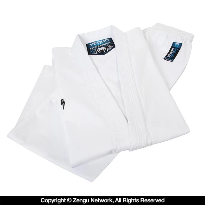 100% cotton Karate Gi by Venum. Featuring heavy-duty stitching reinforcements, woven labels, and a unique brushed interior surface. The tested 8.8oz canvas material is sure to hold up to the toughest training regimen. Equipped with an elastic waistband for an accommodating fit. Adjusted via drawstring.