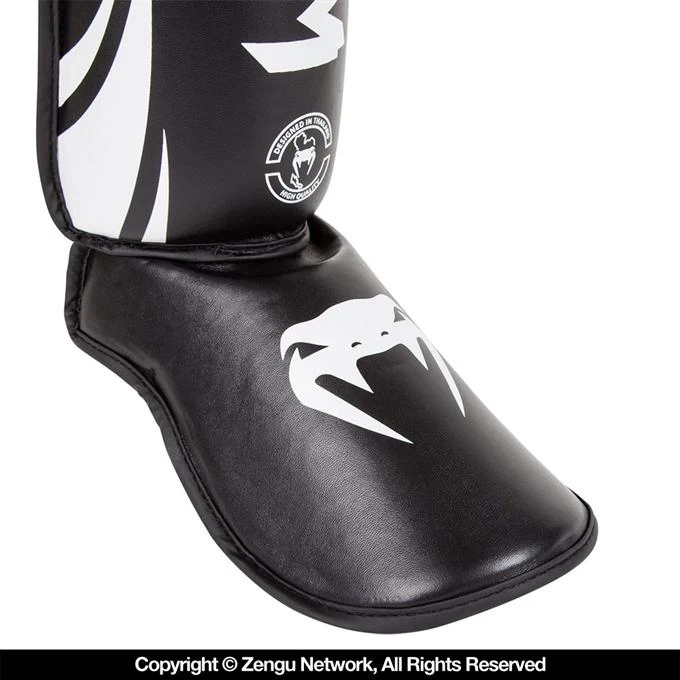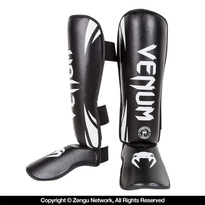 Lightweight new shin/instep guards by Venum, the latest in their popular Challenger Series. Constructed from Venum’s Skintex leather. The outer edges feature soft rounded Skintex piping to prevent discomfort or abrasions to you or your partner while sparring. The interior is filled with high-density foam padding, curved to best suit the natural shape of the shin and foot/instep. Flexible, adjustable hook-and-loop straps ensure that you get just the right fit. Dual straps around the calf, single wide strap around the instep area.