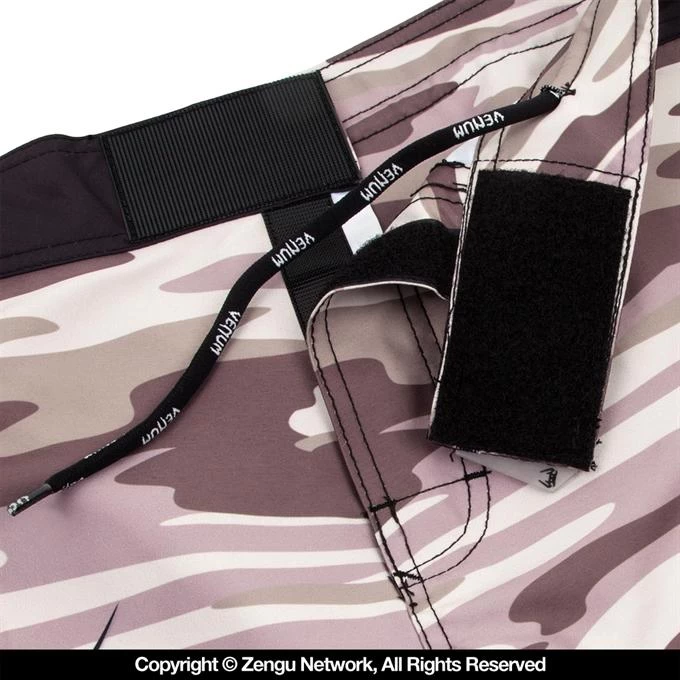 New fight shorts from Venum, featuring a comfortable polyester construction for that lightweight Venum feel. Updated with non-abrasive closures (two directional) and an internal branded drawstring. Securely reinforced seams and sublimated camo artwork throughout. No fading, no peeling. Outfitted with split side vents, which are backed up with a rectangular reinforcement panel. Convenient rubberized pull tab located at the end of the waist closure.
